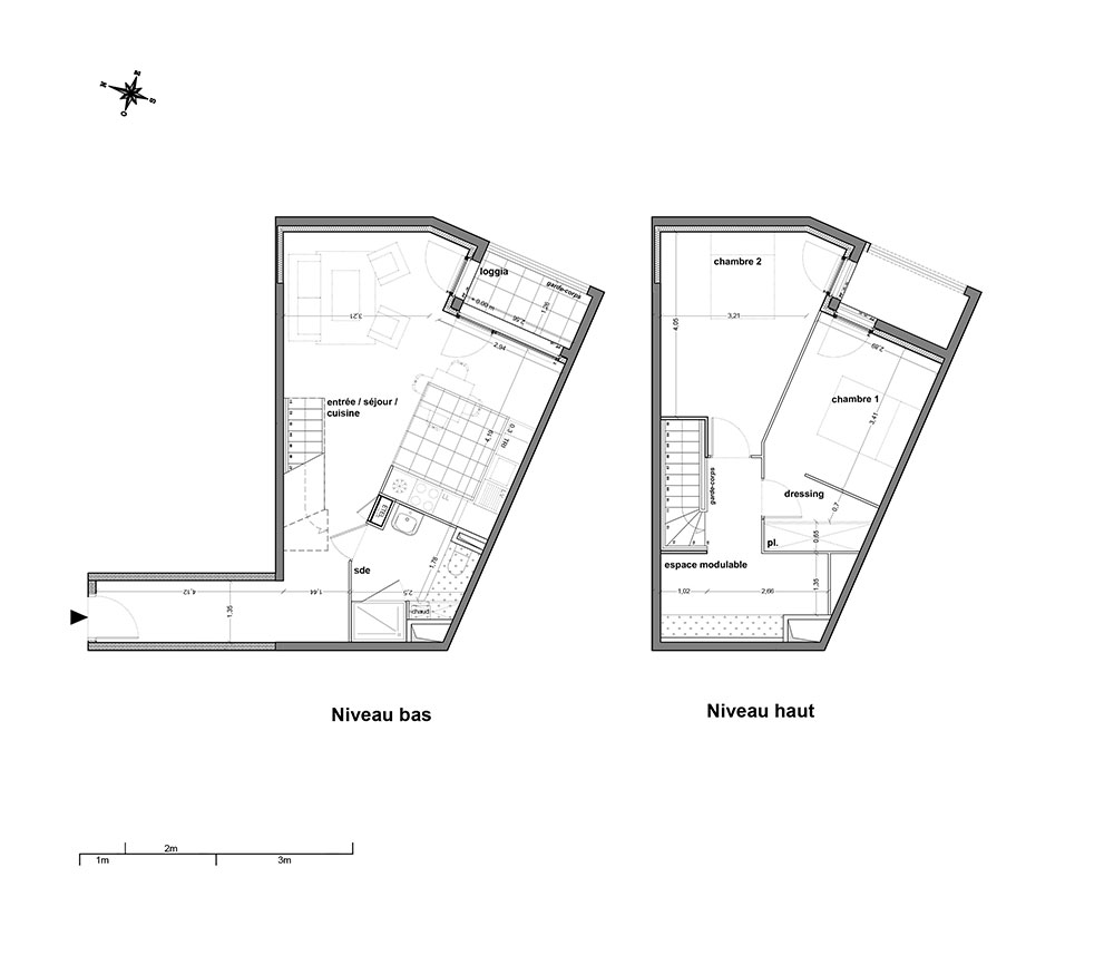 L'ensemble a été pensé comme une superposition de strates en double niveaux, combinant commerces et logements, duplex et simplex, T1 et T5.