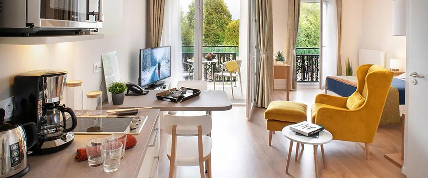 Implantée sur un vaste terrain arboré de plus de 15 000 m², la résidence propose des appartements confortables et lumineux, du studio de 29 m² au T3 de 68 m². Tous sont bien pensés avec salle de bain adaptée, cuisine aménagée et prolongés d’un balcon, d’une terrasse ou d’un jardin privatif avec mobilier inclus. Les résidents profitent de nombreux services facilitant le quotidien : accueil, animations, navette pour les déplacements extérieurs collectifs, blanchisserie, salon de coiffure…