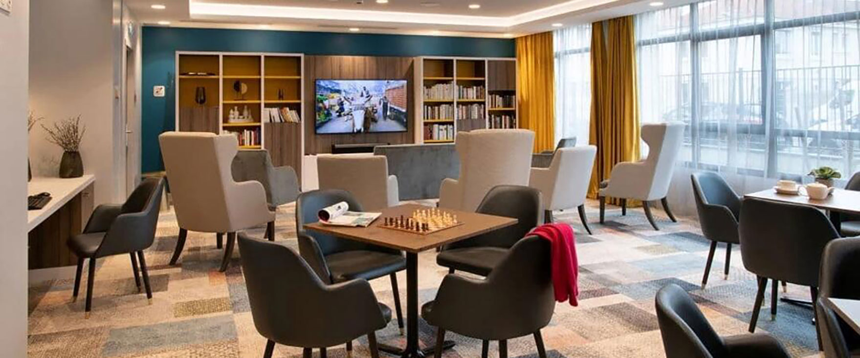 De nombreux services accompagnent le quotidien des résidents : navette, animations, wifi, accueil, blanchisserie et services à la personne. Les espaces communs, chaleureux et variés, favorisent la convivialité et le bien-être : salon de coiffure, bar et restaurant, piscine intérieure et sauna, salon bibliothèque, atelier, salle de gym et jardin paysager.