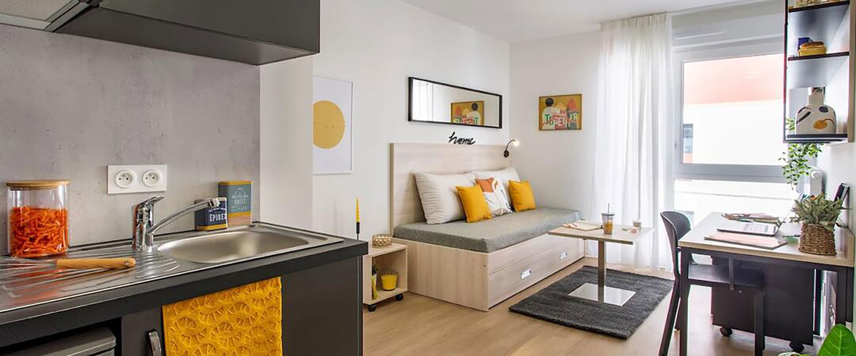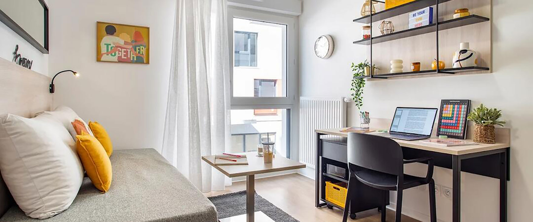 La résidence propose des studios de 18 à 25 m² ainsi que des T2 de 50 m², tous meublés et équipés pour faciliter le quotidien des étudiants. Encadrée par un responsable de résidence, elle met à disposition de nombreux services et espaces communs favorisant la convivialité et le travail : salle commune avec espace détente, TV et babyfoot, espace de coworking, cuisine commune, salle de sport, laverie, parking et service de ménage. Un toit-terrasse avec jardin partagé complète l’offre.